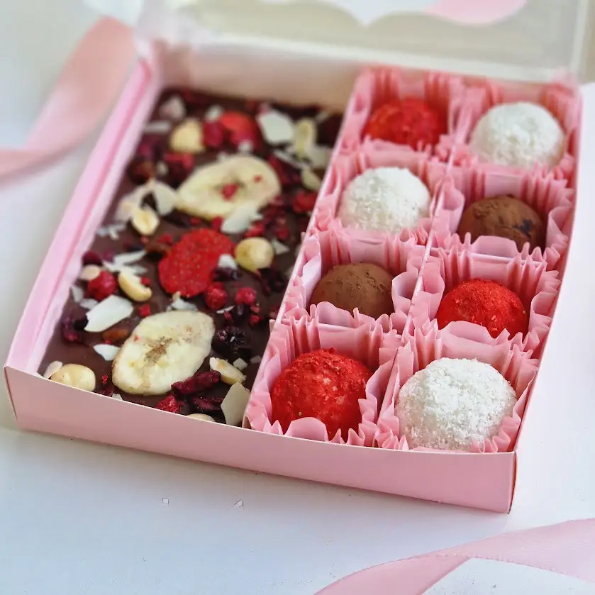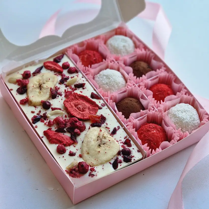 Молочний шоколад з буквами з білого шоколаду, доповнений серцями з горіхами, ягодами та насінням — кожна цукерка з власним смаком і настроєм.🎁