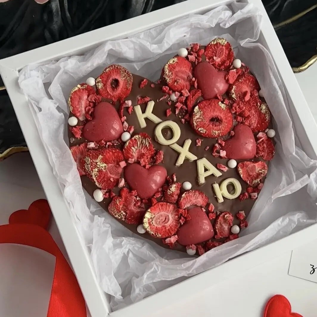 🍫Молочний шоколад у формі серця з написом «КОХАЮ», прикрашений сублімованою полуницею та їстівним декором ❤️